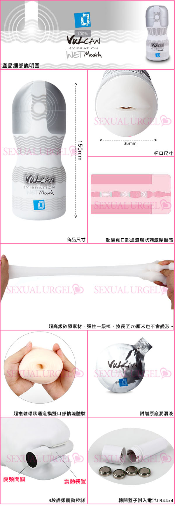 它採用優雅、觸感極好的材質,內部高度仿真,給你最真實的深喉模式。配合各種幻想,你會覺得它無比體貼。特別設計的內部構造,紋理和凹凸起伏恰似真實得器官內部構造,自你進入的那一刻你會發現這一切彷彿是真的,就像真人的嘴巴含住你的寶貝然後深入喉間。濕濕地,滑滑地包裹住你的私處,令你情慾噴湧而出。最妙的是內置子彈頭震動器,震動伴隨著摩擦,將情慾推上頂點!