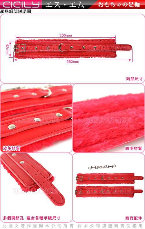 .商品內容:虐戀精品CICILY-紅色警戒-絨毛內襯腳銬 X1