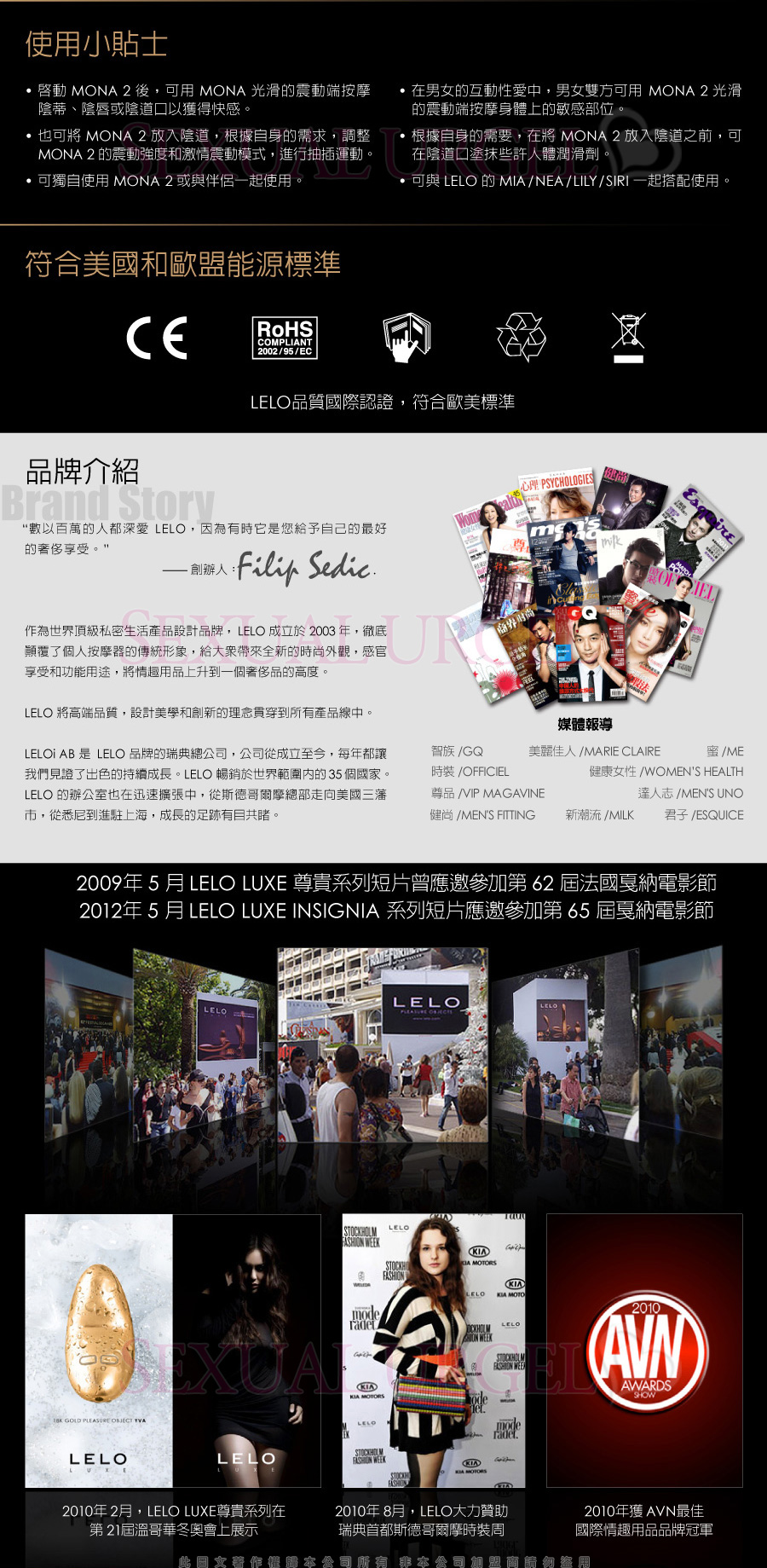 夢娜TM2(MONA 2)是LELO最受歡迎的G點按摩器的全新升級款,動力強度增大一倍,令歡樂刺激更徹底更豐滿,全新推出的完全防水設計特點彰顯奢華的同時,為您帶來更多新鮮刺激。夢娜2(MONA 2)的材質選用觸感超級溫柔細膩的安全矽膠,在觸摸到您身體的那一刻即可與您碰撞出最熱烈的愛慾火花,令您沉迷於6種激情模式不能自拔。夢娜2(MONA 2)令所有同類按摩器黯然失色,深度G點刺激常常讓用戶流連忘返。秉承LELO獨特風格,夢娜2(MONA 2)包裝於漂亮大方的禮品盒中,並享受LELO 1年質保與10年保障雙重質保體系。