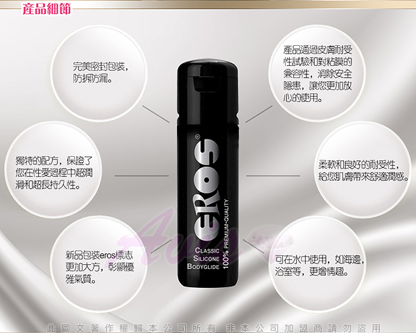 德國原裝進口製造.全球性潤滑劑中的領導品牌,頂級的潤滑油如絲綢般的觸感,極佳的持久潤滑與貼近肌膚的感受性.來自德國的Eros 是Pjur的姊妹牌,長時間的使用也不乾澀,不黏不膩,