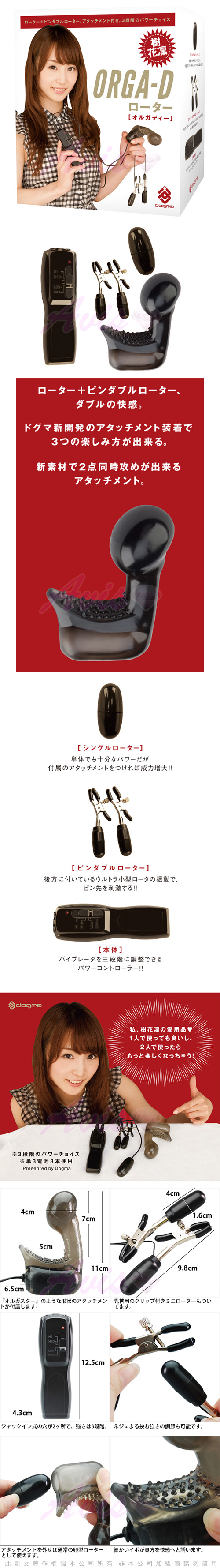 跳蛋、乳頭夾和2股間的自慰器組合。再來是可以將跳蛋輕鬆拆卸Dogma新開発的ORGA-D附加裝置。控制器有3段強弱可供選擇的優質商品。