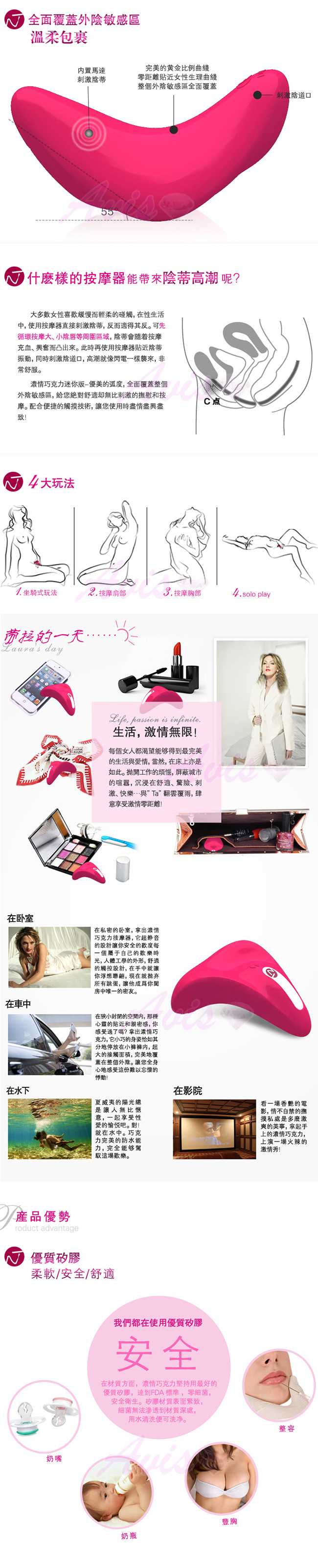 最新出品的專為愉悅女性而開發的流線型按摩震動器。其外形設計完全符合人體工程學原理,首創的觸摸式滑動條輕鬆操控震動強度,