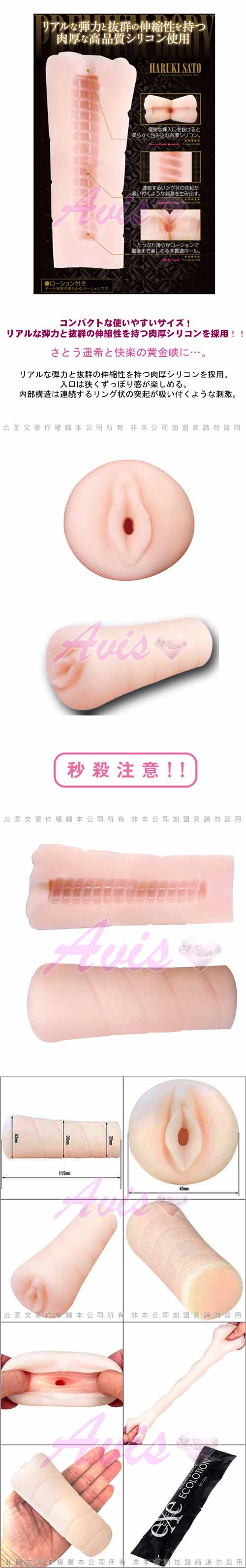 盒裝容易使用的尺寸。採用真實彈力和超群伸縮性的肉厚材質。被狹窄的插入口包覆住的快感。內部構造為連續環狀凸起吸附住的強烈刺激。佐藤遥希的快樂黃金峽・・・。