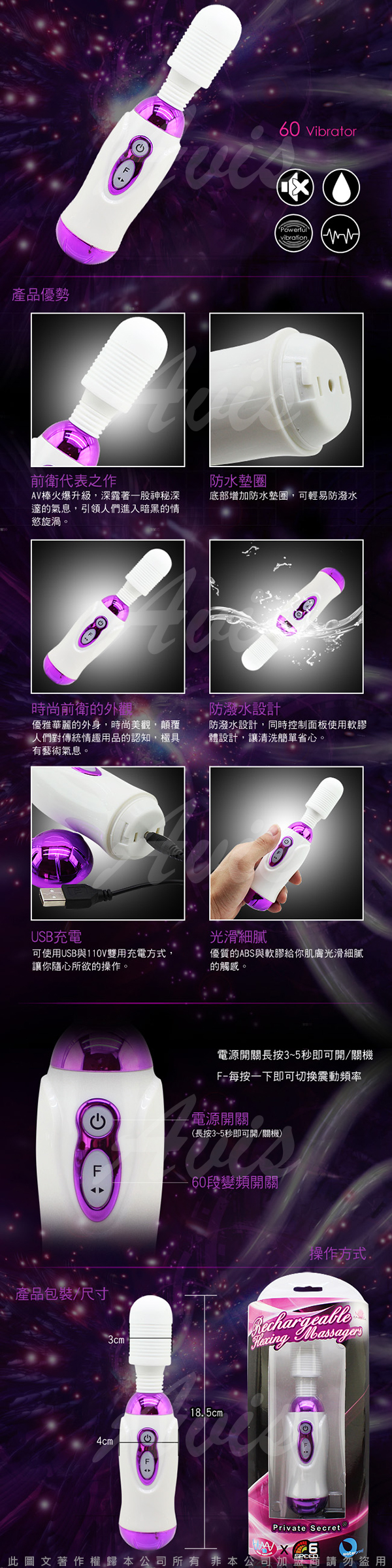 .主商品:APHRODISIA 暴風天使60段變頻(充電式)超強AV女優按摩棒-白紫