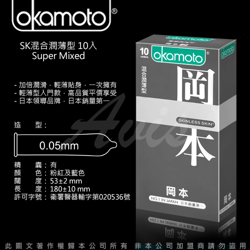 品名:Okamoto岡本 Skinless Skin 混合潤薄型保險套(10入裝)