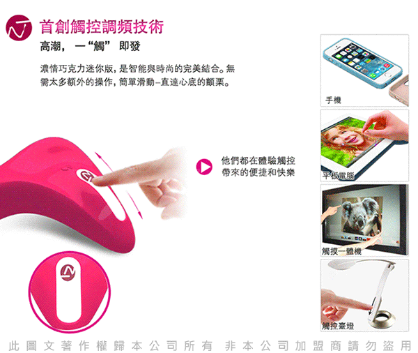 最新出品的專為愉悅女性而開發的流線型按摩震動器。其外形設計完全符合人體工程學原理,首創的觸摸式滑動條輕鬆操控震動強度,