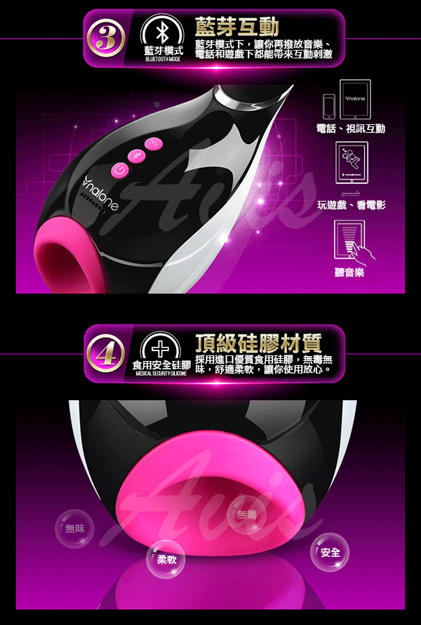 一、飛機杯內發聲裝置可通過藍牙發出手機與電腦內的音樂、視頻聲音,並根據聲音頻率強弱來改變震動的頻率與震動強度哦