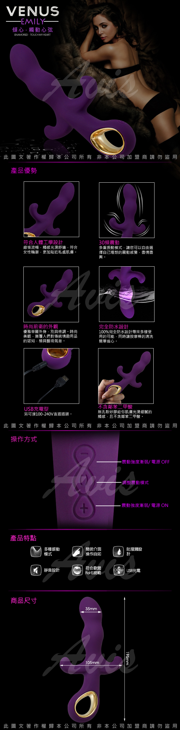 艾蜜莉 多功能 30頻 時尚精品 三點式刺激按摩棒 魅紫