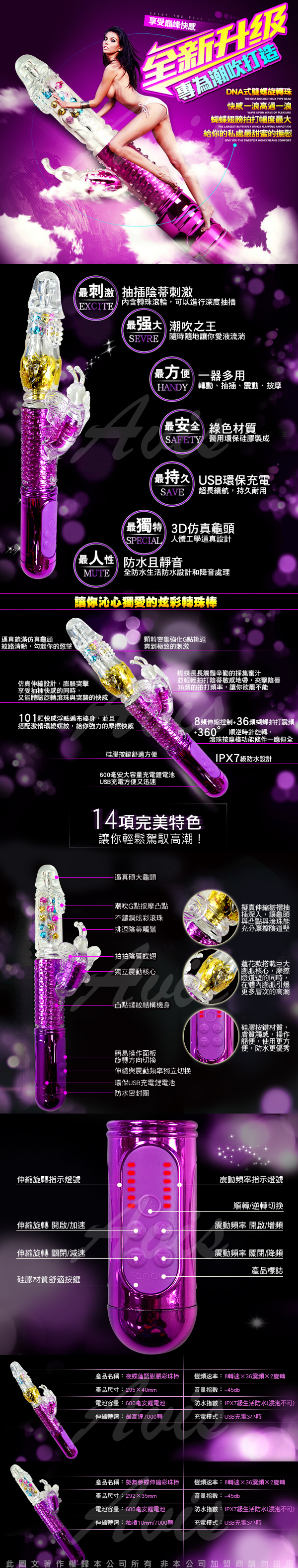 .商品內容:蓮動巧蝶 288段變頻式正逆轉膨脹伸縮USB充電轉珠棒 電鍍紫