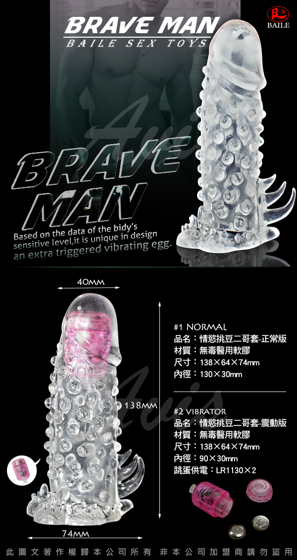.主商品:BRAVE MAN 水晶增粗加長套 顆粒型 震動款