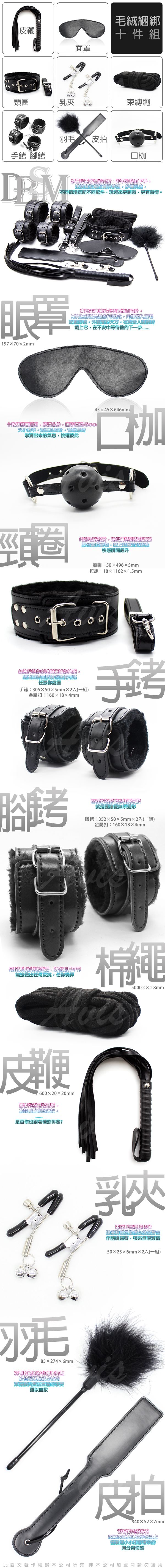 .商品內容:虐戀精品CICILY-束縛遊戲-眼罩手銬腳銬口枷頸圈皮鞭棉繩乳夾羽毛棒皮拍 十件組 黑