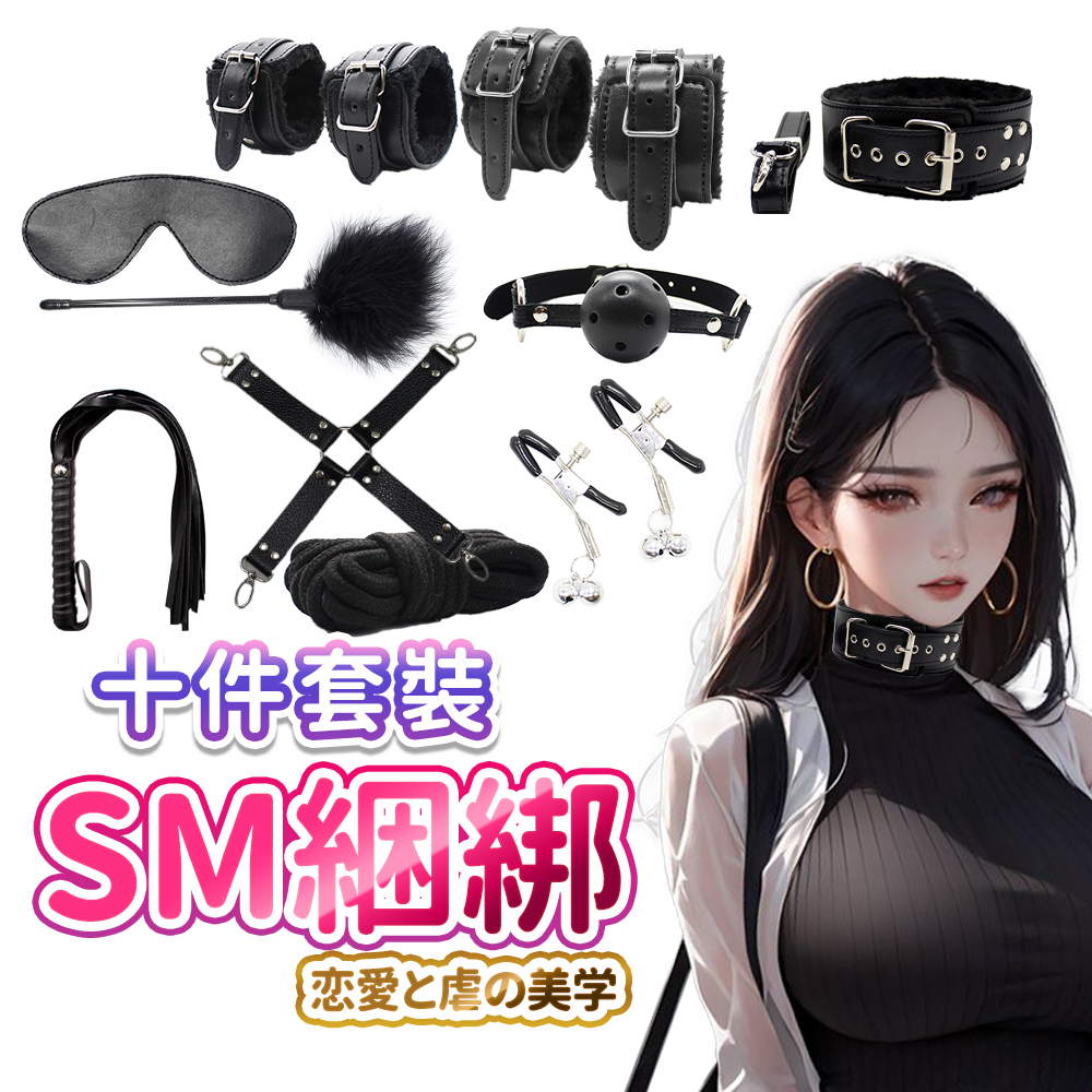 虐戀精品CICILY-無禁的愛 手銬/腳銬/繩子/鞭子/眼罩/脖子套/口塞/乳夾/羽毛/十字扣 十件組 黑