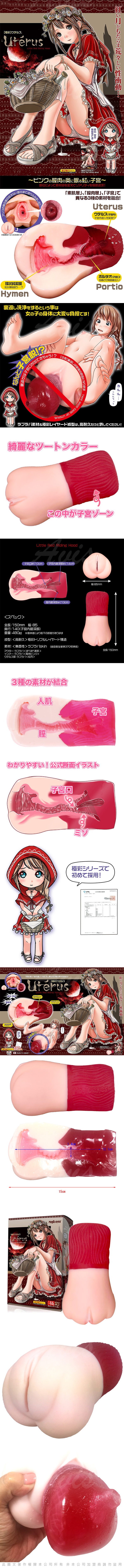 極彩名器 - Uterus 小紅帽的子宮 (ウテルス),就跟他的名字一樣,就是賣子宮!! 將子宮的真實感覺推到極限!! 採用全新的雙層製造方法,更合理的前後雙層構造,確保不會因多次使用而慢慢脫落,玩家不用擔心會有子宮脫落的問題。入口緊,內部緊,子宮更緊!!! 插入長14cm,子宮的位置設在離入口10cm的地方,以確保所有玩家也能順利進口。子宮長4cm,構造有助完全包容你的龜頭,給你非常高的真實感覺。加上480克的重量,非常肉厚,又有手感!!