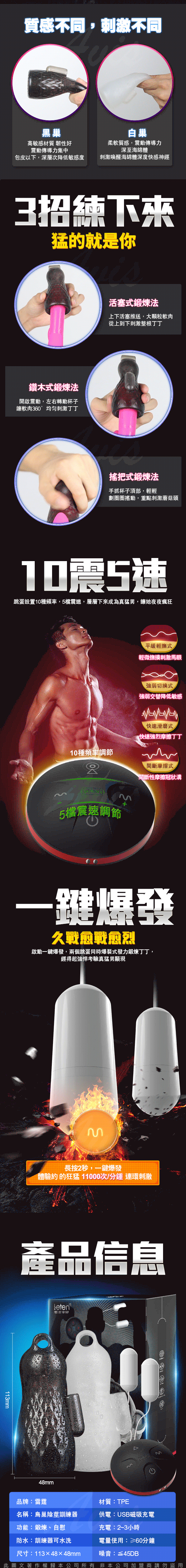 一黑一白套裝材質不同,柔軟度不同,同物理原理刺激,集訓練+自慰雙用於一體,兩巢針對性訓練讓您變久戰,還能爽過癮!跳蛋設置10種頻率,5檔震速可組成15種鍛煉模式,層層下來練就真猛男,讓愛人夜夜瘋狂~且可啟動一鍵爆發同時爆裂式發力鍛煉,再次經起強悍考驗喔!擁有全身防水及靜音功能,讓您盡情享用私密時光。