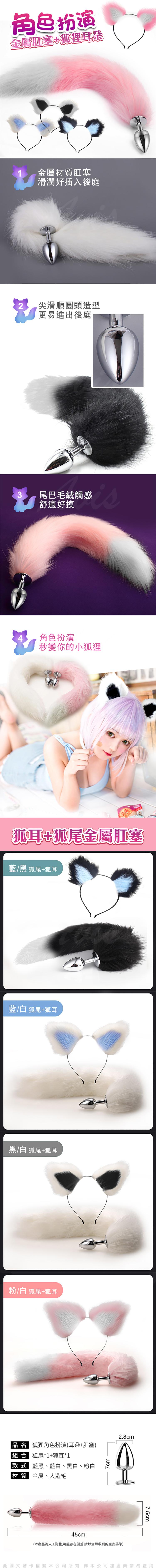 .商品內容:妖豔小狐狸角色扮演 毛絨耳朵+不鏽鋼肛塞尾巴 狐狸尾 .商品材質:金屬肛塞 + 人造狐狸毛.商品尺寸:如圖.商品料號:YL-00106 白/粉