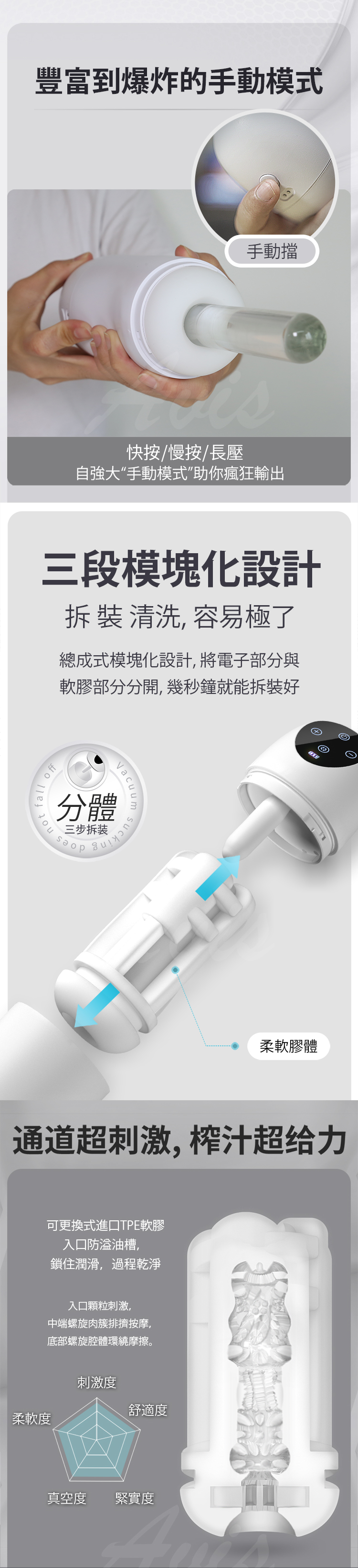 通電後可以在杯腔內產生源源不斷地,空氣負壓進而帶動膠體收縮蠕動,整體效果非常接近真人