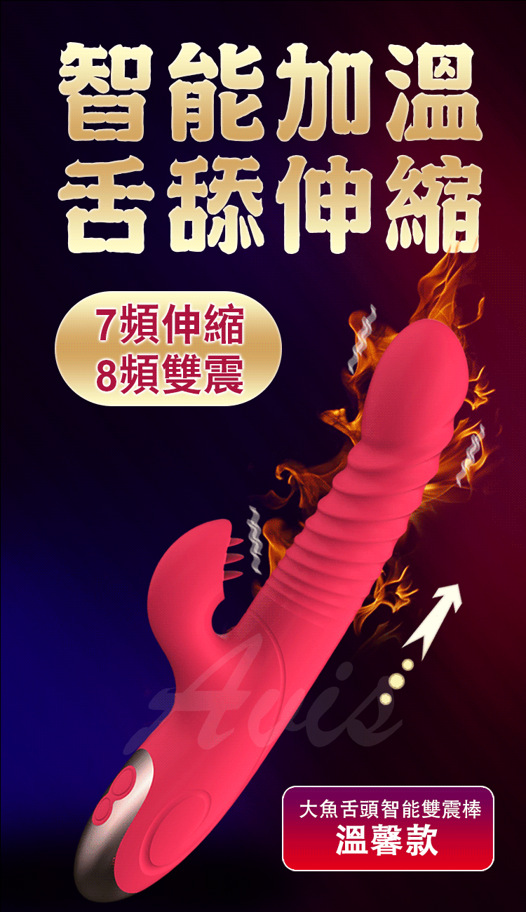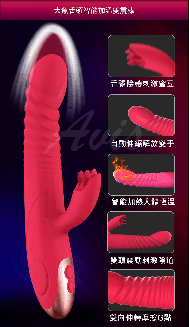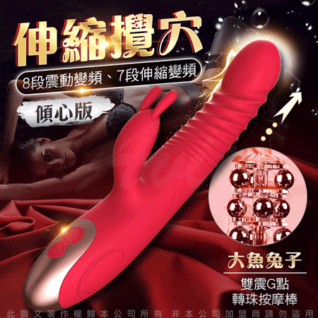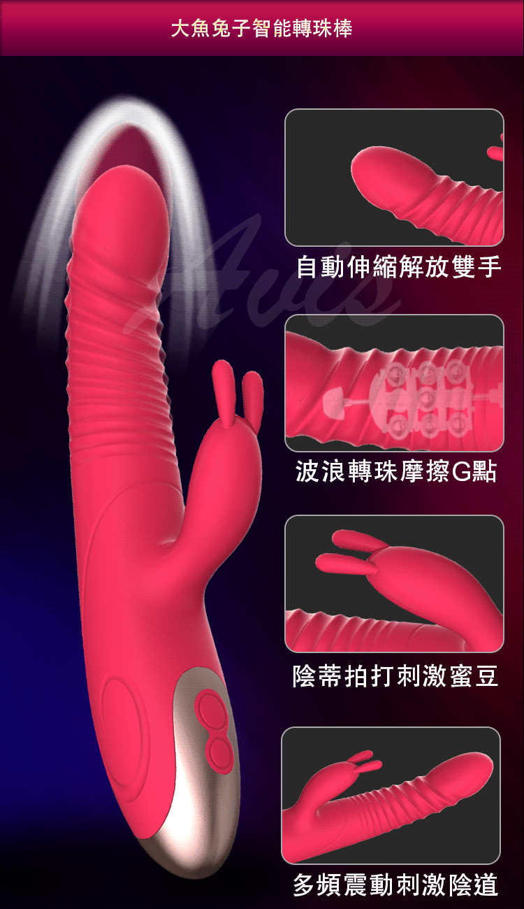 大魚系列兔子版為擁有一棒多用功能全面再升級!!強勁8段變頻震動搭配7頻自動伸縮功能雙面迎擊,讓您淫水源源不絕攪動您的花心。符合女性私密結構設計更緊密的貼合,在抽插的碰撞G點同時兔頭拍打您的蜜豆讓您感受連環性全身抽搐快感。採用一體設計防水功能讓您清洗方便使用愉快