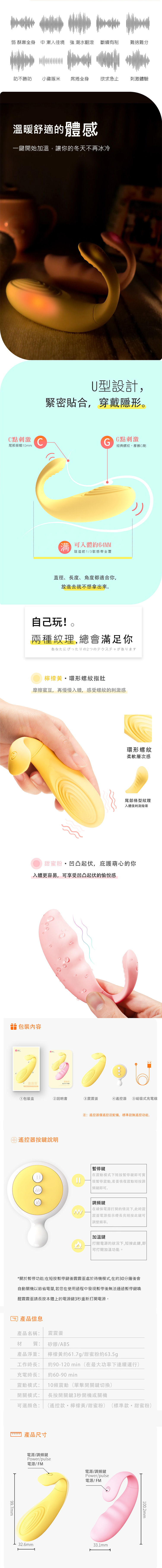 10種頻率不同玩法。跳蛋採U型彈性尾部溫柔貼合人體外肛/陰部線條,讓您可外出使用,搭配無線遙控讓您與愛人更加貼近喔