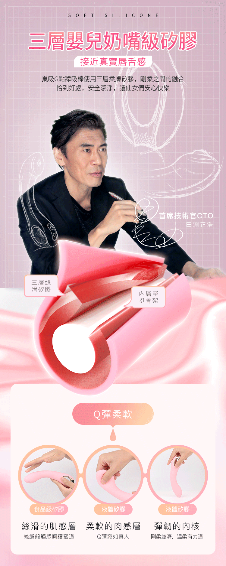 巢吸G點舔吸棒使用三層柔膚矽膠,剛柔之間的融合