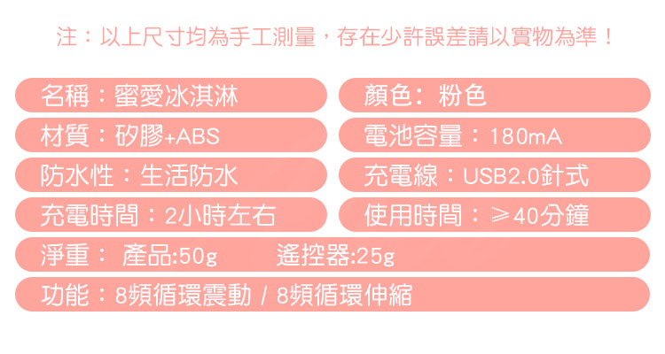 蜜愛冰淇淋無線遙控跳蛋擁有8段伸縮變頻輕鬆抵達敏感部位,刺激內外同時夾擊一同爽。無線遙控讓您一鍵在手,即使在體內也可達遙控,從此她的激情逃不出你的掌心。震動同時還全自動伸縮動力強勁,一次強有力的撞擊勝過多次慢吞吞的摩擦。此款輕鬆好入體,比手指略大一些入體毫無壓力,不撐大仙女們的嬌嫩蜜穴喔~~