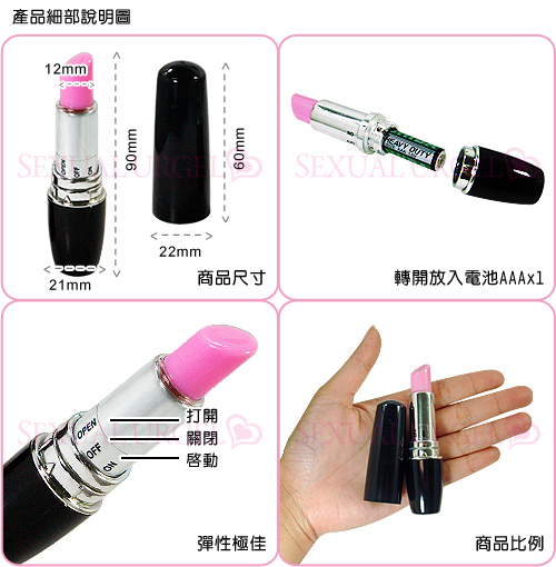 今天用粉紅色的明快的唇膏來引誘男朋友。轉動唇膏突然震動,這是什麼呀!!就是它,唇膏型小型玩物!就象真的唇膏一樣,轉動本體就會強烈震動。震動非常強,就象發動機一樣地震動。先端又是尖的,對於像陰蒂等小的部分可以很方便地刺激。而且從外觀上來看,即使時常放在化妝包裡,也不會讓人覺得奇怪,外出辦事很方便。
