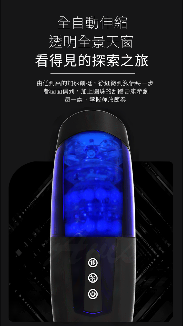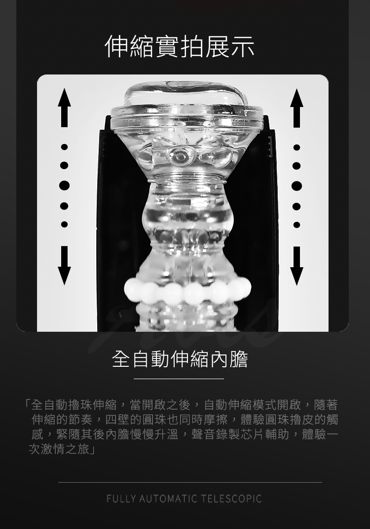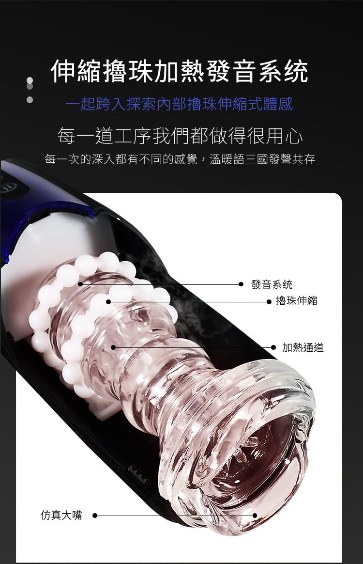 全自動擼珠伸縮,當開啟之後,自動伸縮模式開啟,隨著伸縮的節奏,四壁的圓珠也同時摩擦,體驗圓珠擼皮的觸感,緊隨其後內膽慢慢升溫,聲音錄製芯片輔助,體驗一次激情之旅