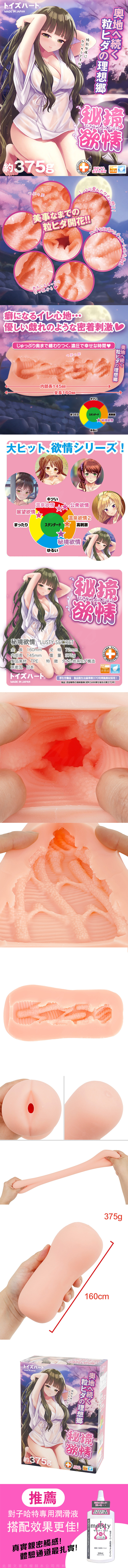 全重約375g,插入長14.5cm,內部通道以不規則的類螺旋狀製造,數條隆起的肉塊,表面佈滿了小肉粒。隨著你的巨龍移動而回應你每一個動作,加上圓形的入口能製造強大的啜效果,使月手感極之刺激。