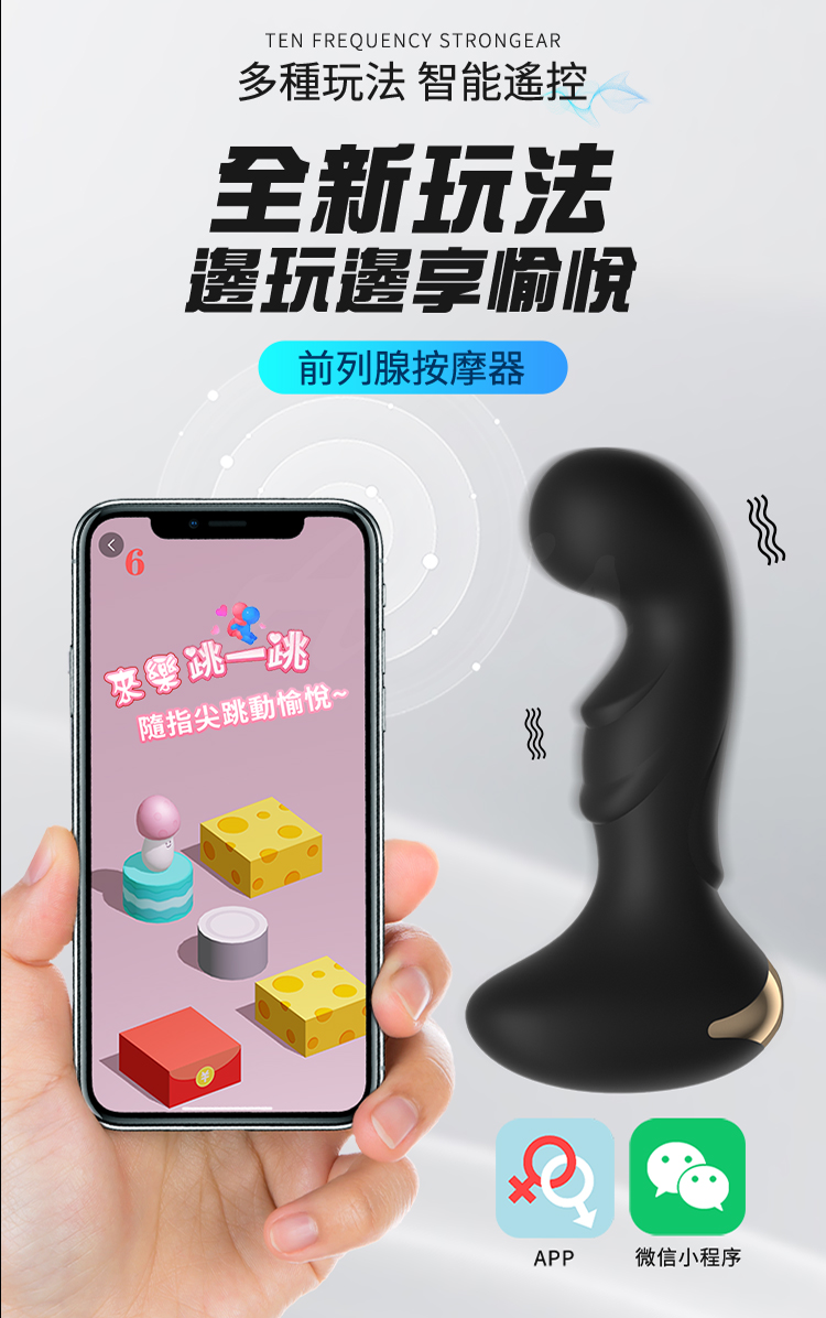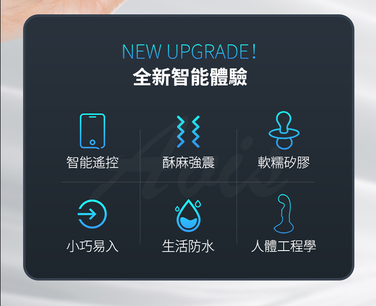 全新智能體驗:擁有智能遙控、酥麻強震功能,使用柔軟矽膠材質,小巧易入,具有人體工程學設計,並具備生活防水功能。
