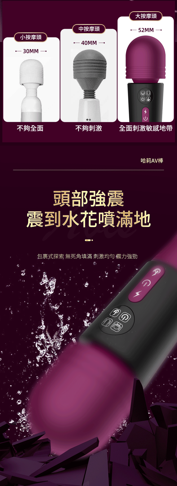 52mm巨型按摩頭,深入敏感區域,帶來全方位的酥麻刺激,點燃慾望之火。12種震動模式隨心切換,讓你從輕柔撫慰到強烈衝擊,層層疊加,直至敏感爆發。