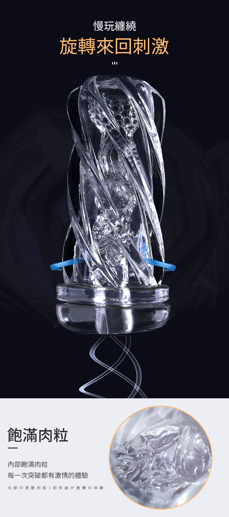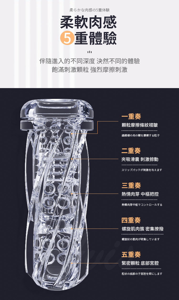 多層次緊繃感:無論是內壁的螺旋設計,還是對松緊度的精準掌握,每一次使用都會感受到強烈而深刻的快感。